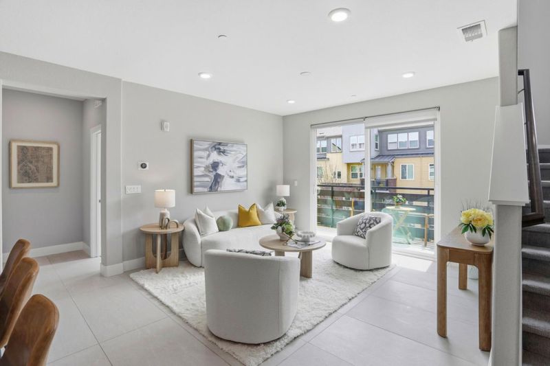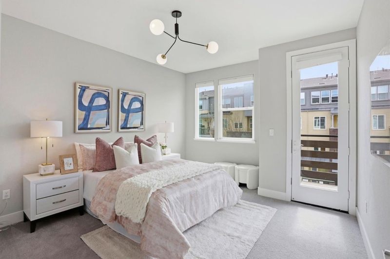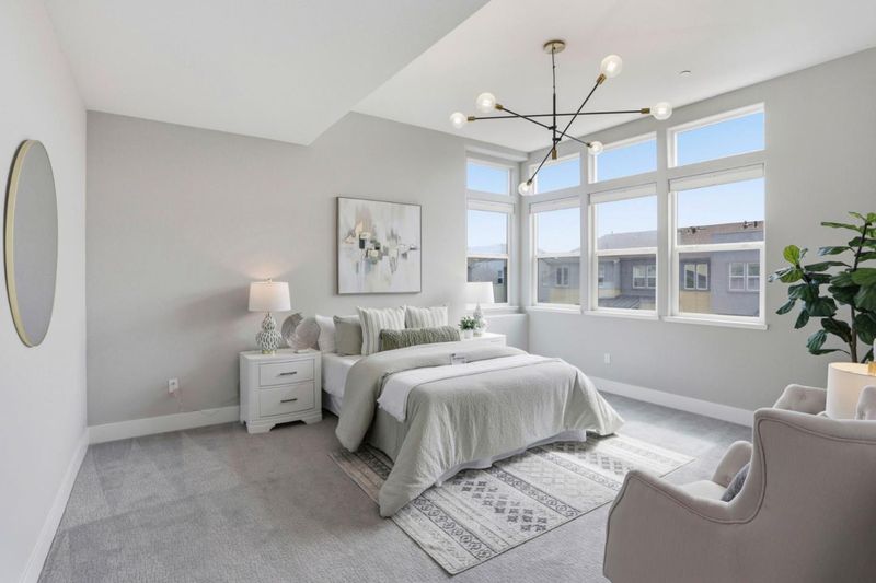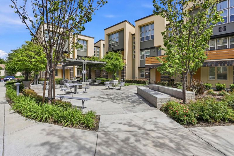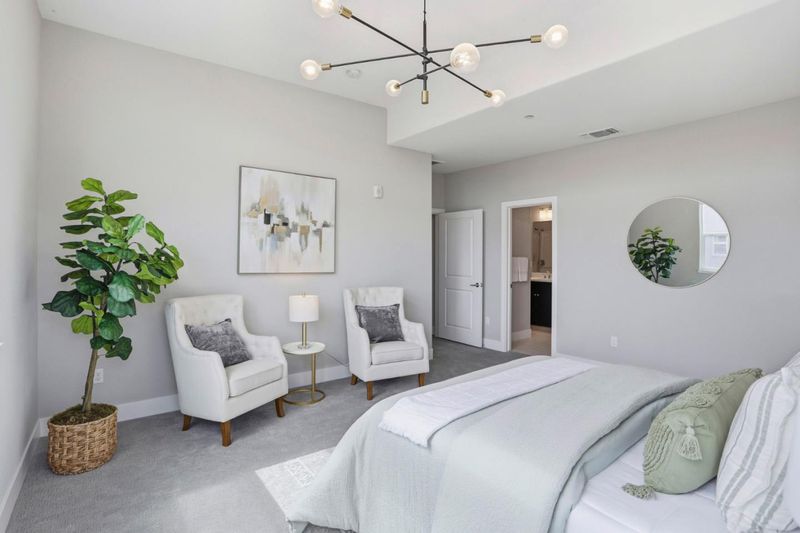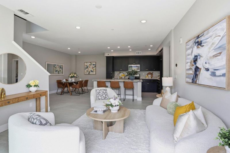 Immaculate and impeccably maintained, this townhome boasts a central location and stunning open views. It features abundant large picture windows that offer lush views and opulent soothing natural light. The open floor plan is decorated in contemporary neutral colors and high end luxurious finish with elegant oversized slab tiles throughout. The spacious and functional kitchen is equipped with ample Shaker cabinets, SS appliances, expansive quartz counters, and a large central island with convenient breakfast bar. Step out onto the intimate deck from the living room, seamlessly blending indoor and outdoor living. The generous master suite includes airy elevated ceilings, walk-in closet with elaborate organizers, and a lavish ensuite bath. The secluded main floor guest/in-law bedroom is adjacent to a full bath, providing privacy and convenience. Additional features including prewired electric car charging plug in the finished garage. Enjoy outdoor activities in the nearby Newbury Park. Community amenities include a BBQ/picnic area and a dog-friendly park. Convenient location: short commute to downtown San Jose, Japantown, and shopping centers like Costco, Ranch 99, and H-Mart, easy access to BART, VTA, freeways 101/680, and within walking distance to Google and Meta shuttle stops.