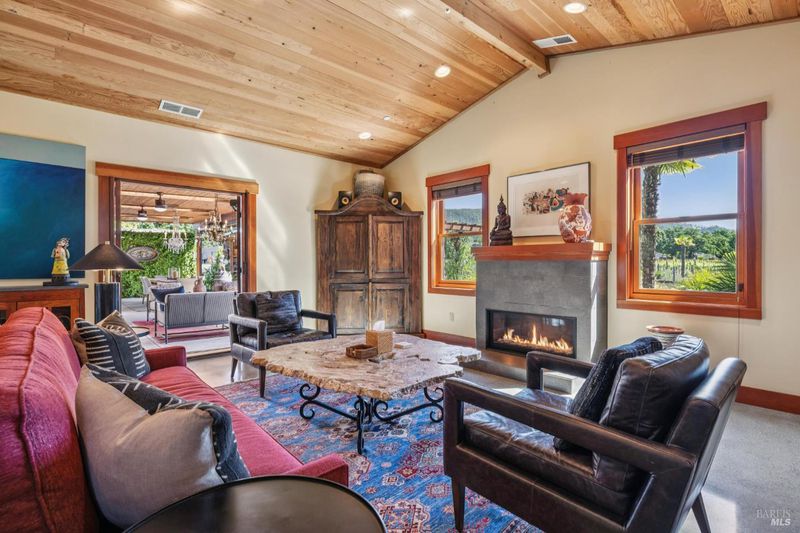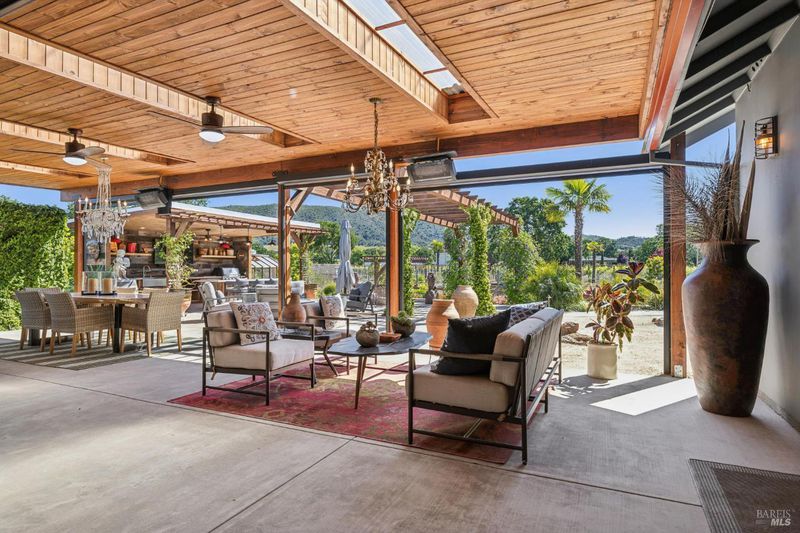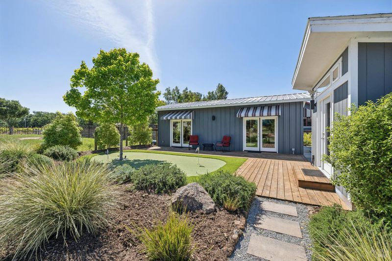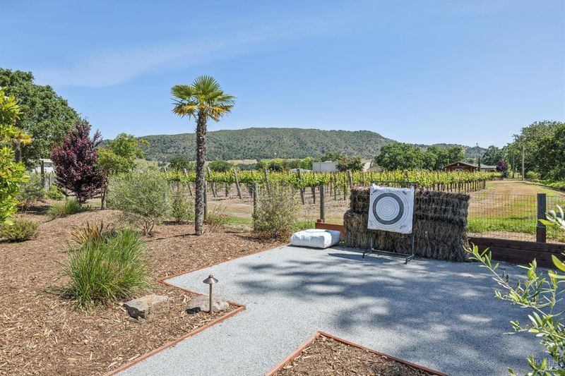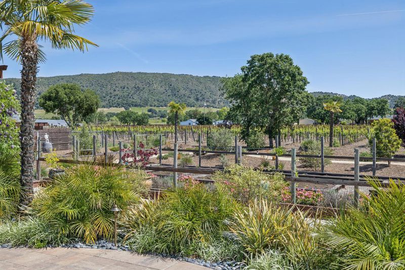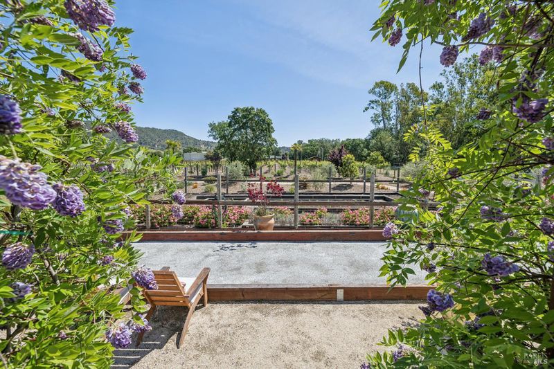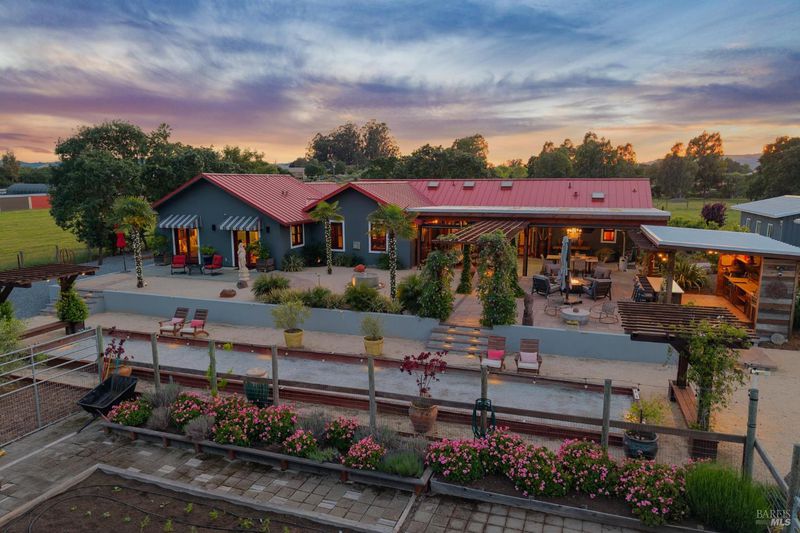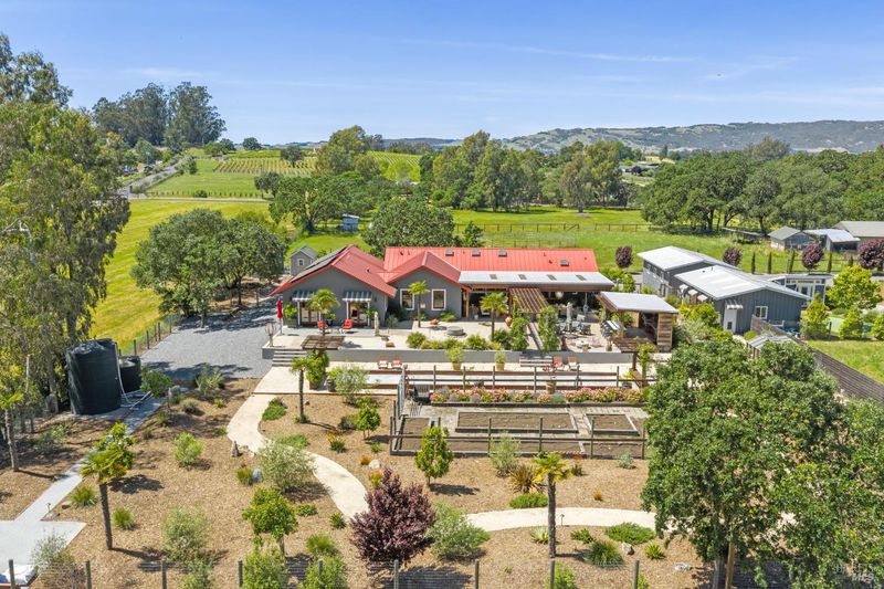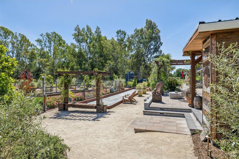 A long private tree-lined driveway leads to this gated estate, offering sweeping vineyard and countryside views on 1.5+/- acres. The single-level main home features 3 bedrooms and 3.5 bathrooms all en suite designed for seamless indoor/outdoor living. Thoughtful details include polished concrete floors, wood-clad vaulted ceilings and a cozy gas fireplace anchoring the living room. The newly reimagined chef's kitchen is equipped with new cabinetry, a Miele gas cooktop, a Sub-Zero refrigerator, 2 Jennair ovens, oversized island, and stone countertops. Enjoy year-round entertaining under the covered patio with chandeliers, built-in heaters, electronic shades, fans, and a gas fire pit. An outdoor kitchen and bar complete with BBQ, pizza oven, cooktop, and refrigerator overlook raised garden beds, olive trees, bocce ball court, and neighboring vineyards. A stylish detached studio offers skylights, art room, custom barn doors, full bath and laundry to add flexibility. The building overlooks a redesigned landscape, including walking path with fruit trees. Adjacent to the studio lies a detached outbuilding utilized for sports equipment storage, but can easily be converted to an office. Additional features of the home include two garages, an EV charger, putting green, owned solar, metal roofs, water catchment system with storage tanks, water softener, and generator. The ideal Wine Country retreat just 10 +/- minutes to Sonoma Plaza, 15 +/- minutes to Napa, and 45 +/- minutes to the Golden Gate.