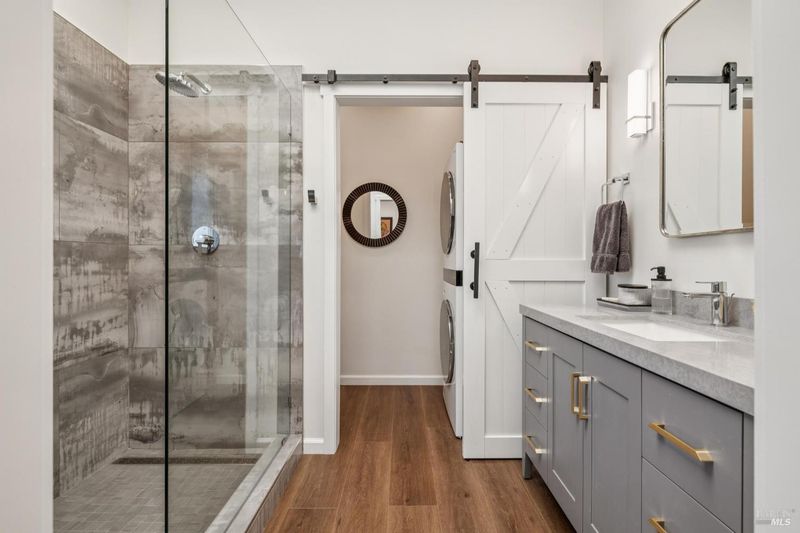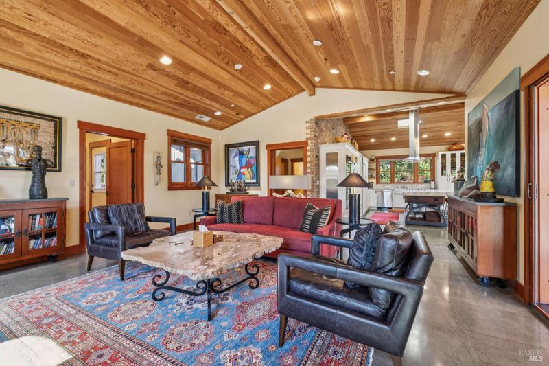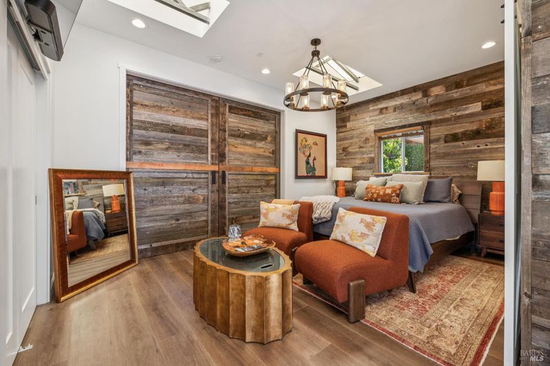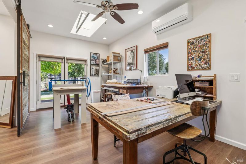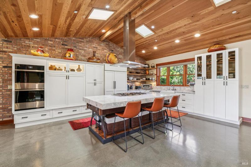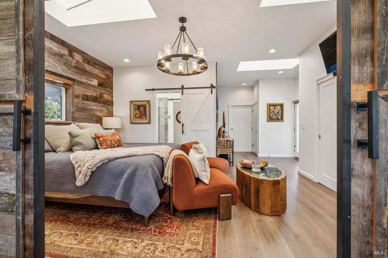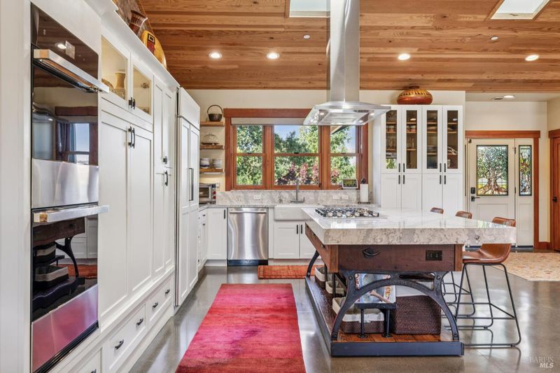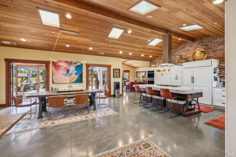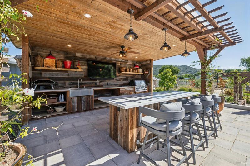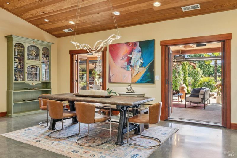 A long private tree-lined driveway leads to this gated estate, offering sweeping vineyard and countryside views on 1.5+/- acres. The single-level main home features 3 bedrooms and 3.5 bathrooms all en suite designed for seamless indoor/outdoor living. Thoughtful details include polished concrete floors, wood-clad vaulted ceilings and a cozy gas fireplace anchoring the living room. The newly reimagined chef's kitchen is equipped with new cabinetry, a Miele gas cooktop, a Sub-Zero refrigerator, 2 Jennair ovens, oversized island, and stone countertops. Enjoy year-round entertaining under the covered patio with chandeliers, built-in heaters, electronic shades, fans, and a gas fire pit. An outdoor kitchen and bar complete with BBQ, pizza oven, cooktop, and refrigerator overlook raised garden beds, olive trees, bocce ball court, and neighboring vineyards. A stylish detached studio offers skylights, art room, custom barn doors, full bath and laundry to add flexibility. The building overlooks a redesigned landscape, including walking path with fruit trees. Adjacent to the studio lies a detached outbuilding utilized for sports equipment storage, but can easily be converted to an office. Additional features of the home include two garages, an EV charger, putting green, owned solar, metal roofs, water catchment system with storage tanks, water softener, and generator. The ideal Wine Country retreat just 10 +/- minutes to Sonoma Plaza, 15 +/- minutes to Napa, and 45 +/- minutes to the Golden Gate.