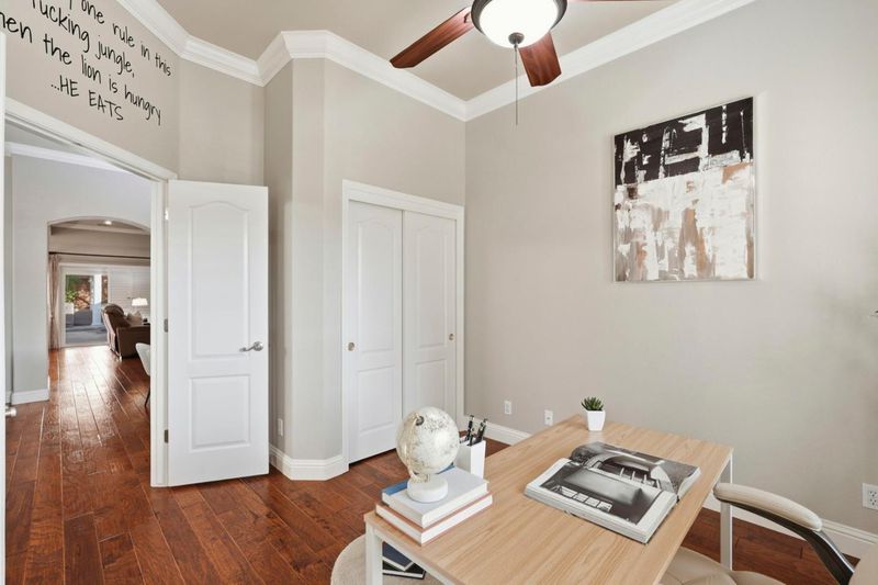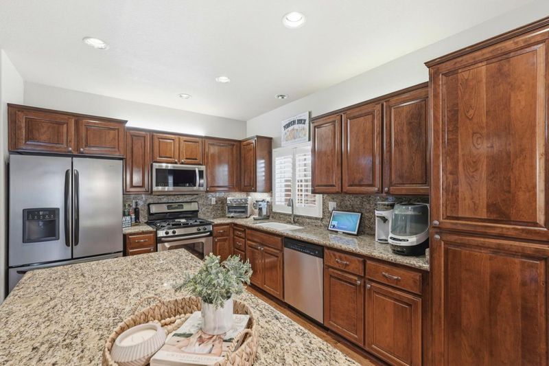 Come see this beautifully maintained single-story home in one of Turlocks highly desirable neighborhoods! Built in 2004, this 4-bedroom, 2-bath residence offers a thoughtful floor plan with a bright living room and formal dining nook at the entrance, flowing into a spacious secondary living area and remodeled kitchen. The kitchen features a large island with a breakfast bar, polished granite counters, stainless appliances, and an eat-in dining area perfect for meals and entertaining. Hardwood flooring, crown molding, recessed lighting, custom shutters, and window dressings add elegance throughout. The bedrooms are generously sized and thoughtfully positioned: one near the entrance is perfect for guests or as a home office, while the other three are tucked in for privacy and comfort. The primary suite includes a spa-like ensuite bathroom with a soaking tub, dual sinks, and a walk-in closet. Outside, enjoy low-maintenance landscaping and a backyard retreat ideal for relaxing or hosting friends. With its warm, inviting layout, stylish updates, and prime location near schools, parks, shopping, and all the conveniences of this sought-after neighborhood, this home is truly move-in ready and offers the perfect blend of comfort, style, and convenience.