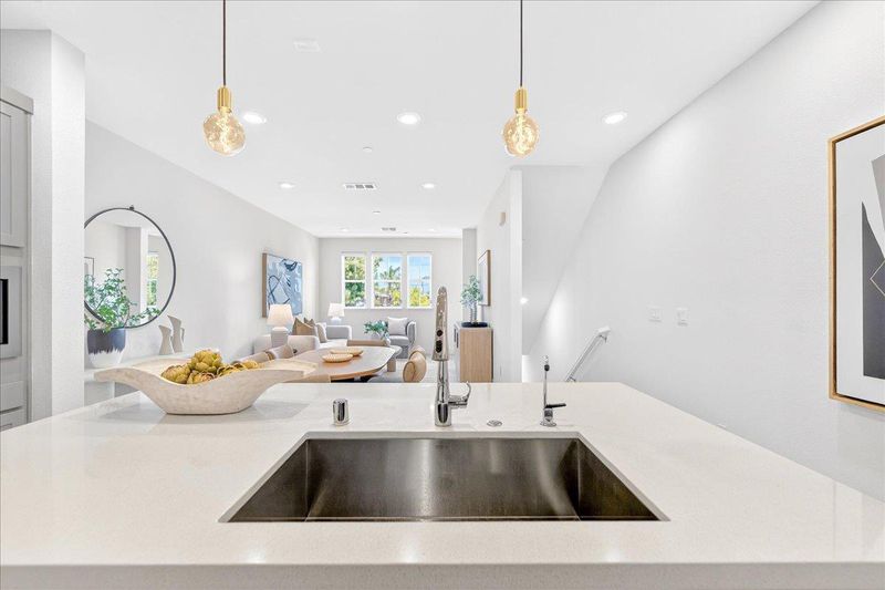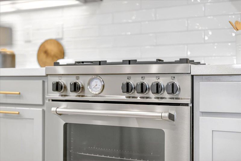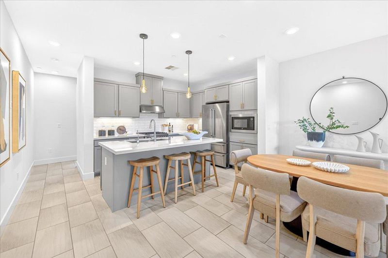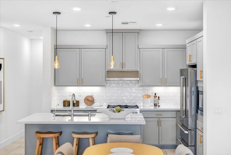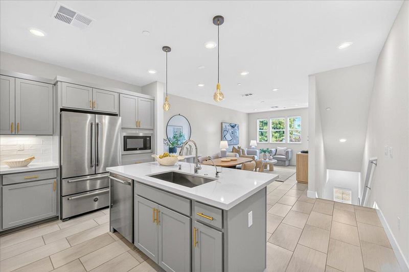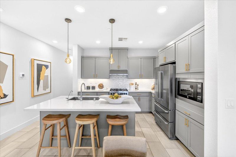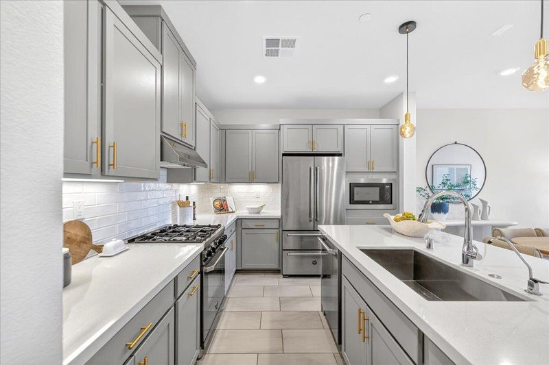 - Countertop - Quartz, Dishwasher, Exhaust Fan, Garbage Disposal, Hood Over Range, Island with Sink, Microwave, Oven Range - Gas, Refrigerator